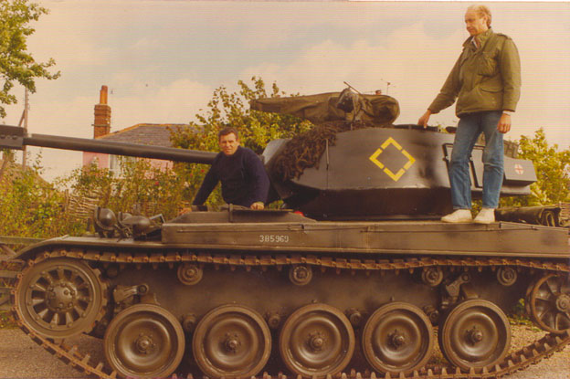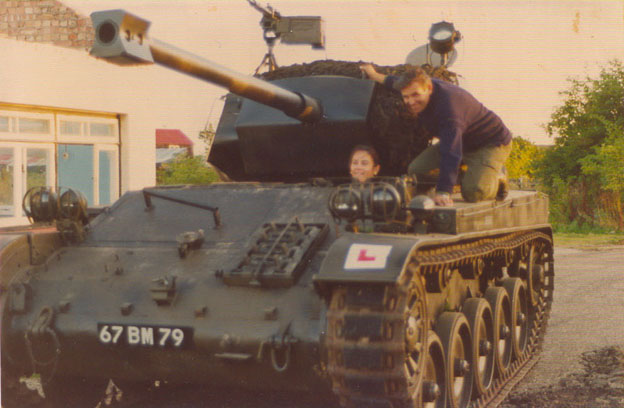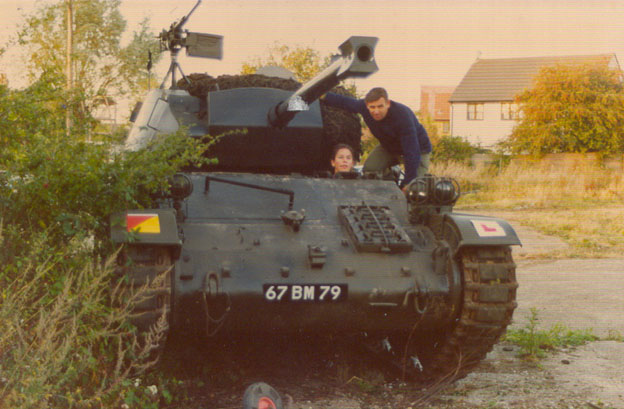 Teaching my wife to drive the tank during a break in television filming with Toyah Wilkox for the series 'Game For A Laugh'.