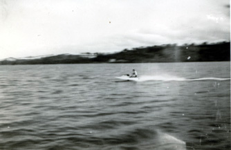 The hydroplane on it's first test runs in the Orakie Basin 1965. Engine was purchased from a motorcycle shop in Onehunga